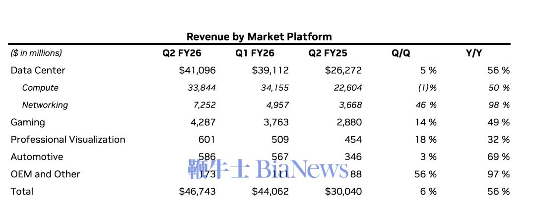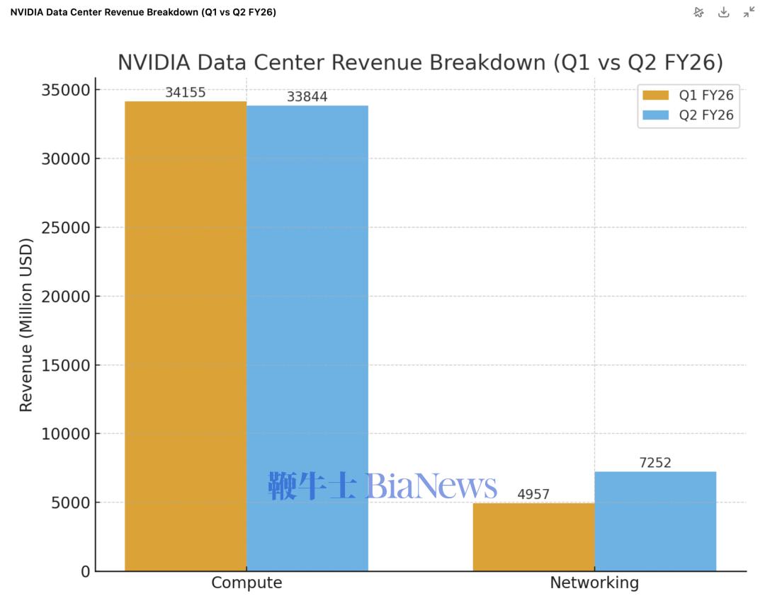 但总体来看,H20 芯片相关的收入相比第一季度仍然锐减了约 40 亿美元。这就解释了为何计算业务在第二季度出现了环比 1% 的微幅下滑——因为它是在与一个包含了「一次性」高收入的第一季度作比较。